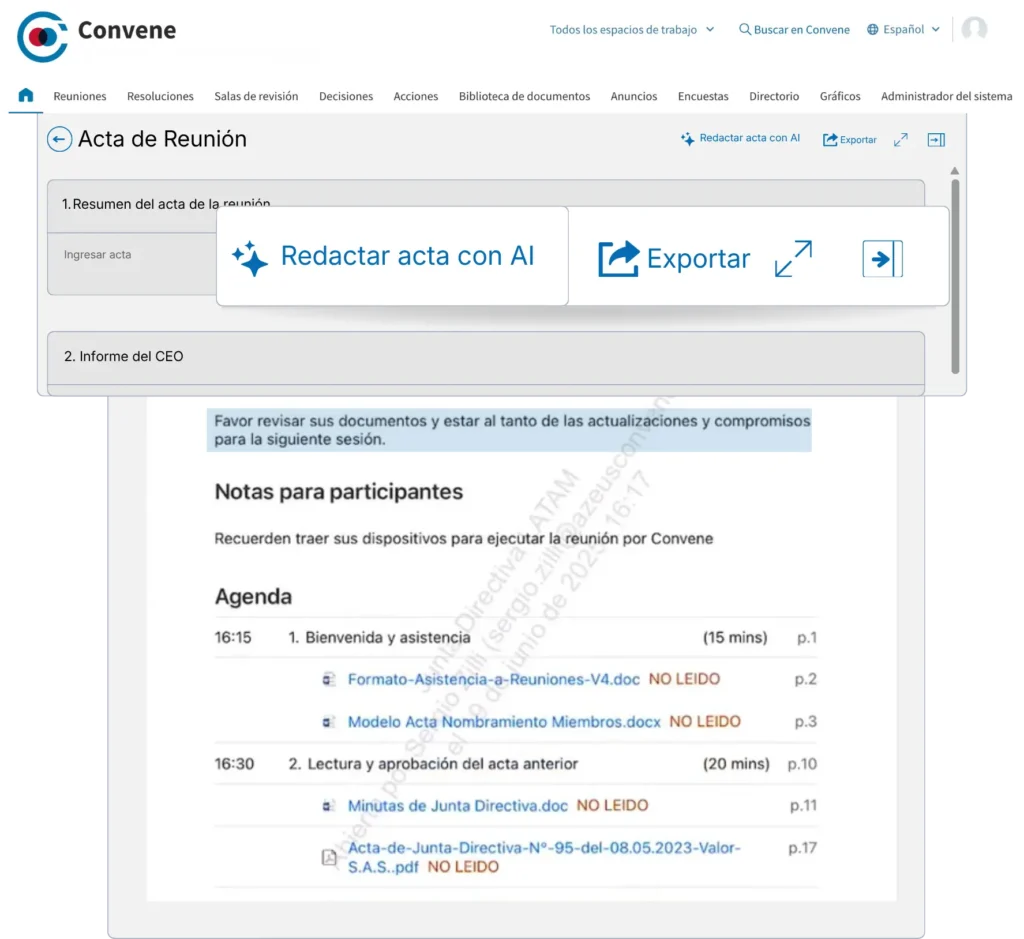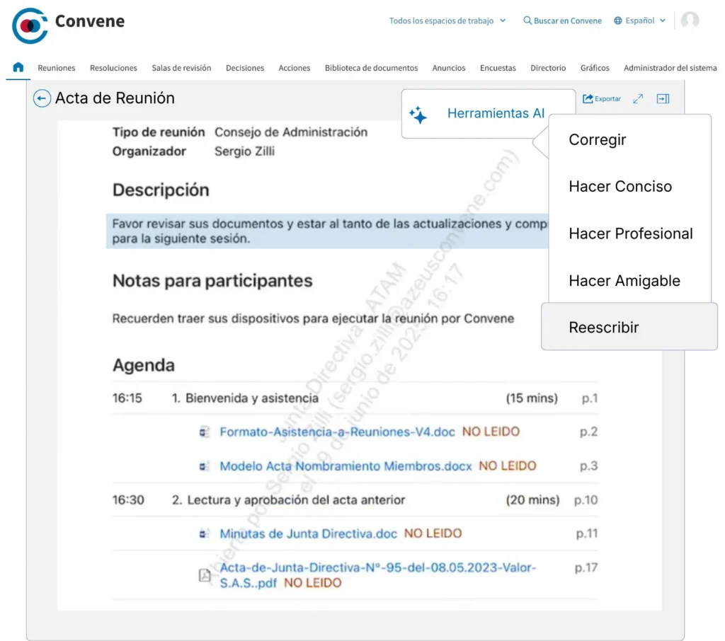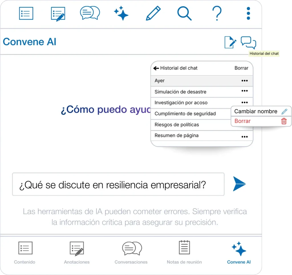 Convene integra la IA de una forma fácil de usar. Pensada para que los miembros del gobierno corporativo, sin importar su nivel de experiencia digital, puede tomar decisiones bien fundamentadas.